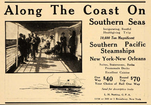 This is an original 1911 black and white print ad for cruise travel, New York - New Orleans, via Southern Pacific Steamships.