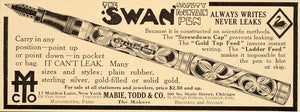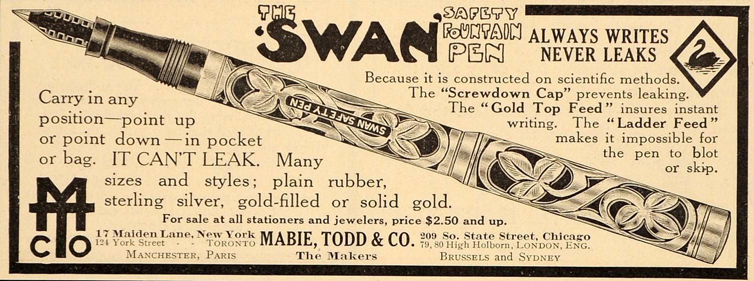 This is an original 1911 black and white print ad for the Swan Safety Fountain Pen from Mabie, Todd & Co.