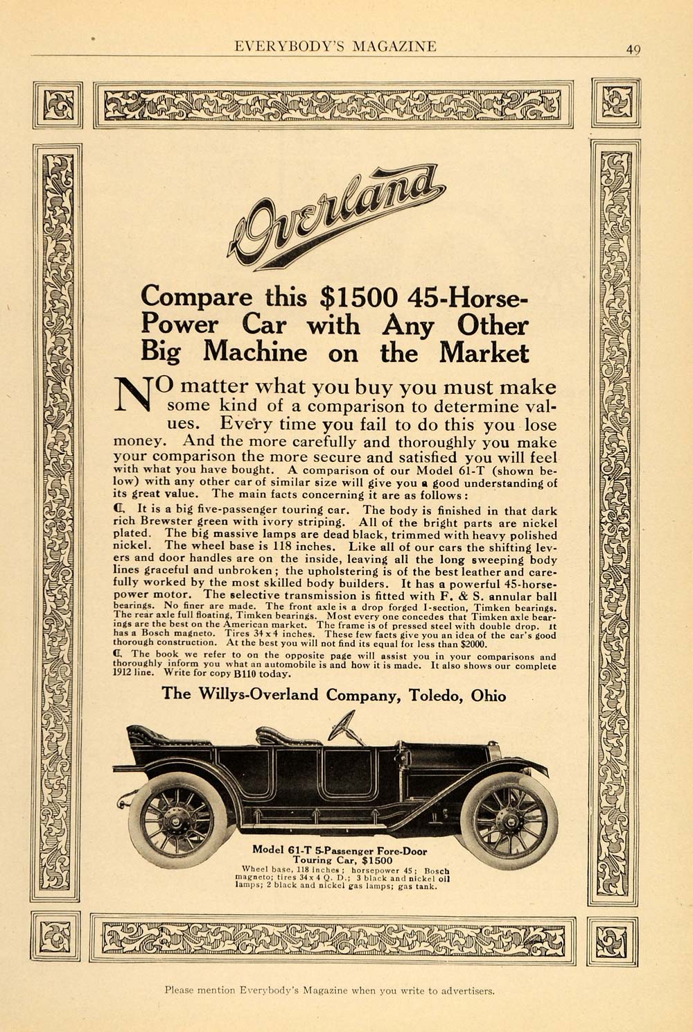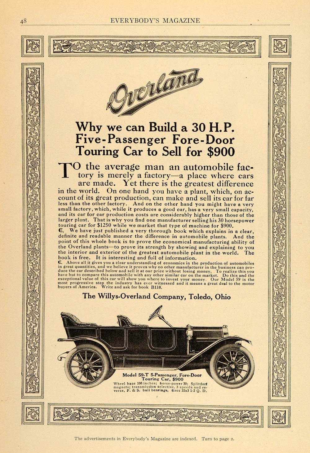This is an original 1911 two-page black and white print ad for Overland automobiles from The Willys-Overland Company of Toledo, Ohio. Shown here are the Model 59-T 5-Passenger, Four Door Touring Car ($900) and the Model 61-T 5-Passenger, Four Door Touring Car ($1500). Please see both images. These are excellent original print items for the collector of these antique cars!