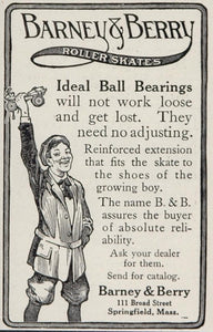 This is an original 1911 black and white print ad for Roller Skates with Ideal Ball Bearings from Barney & Berry, 111 Broad Street, Springfield, Massachusetts.