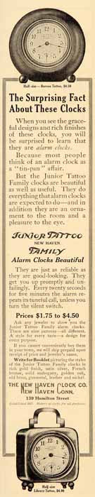 This is an original 1912 black and white print ad for the Junior Tattoo Family Clocks.