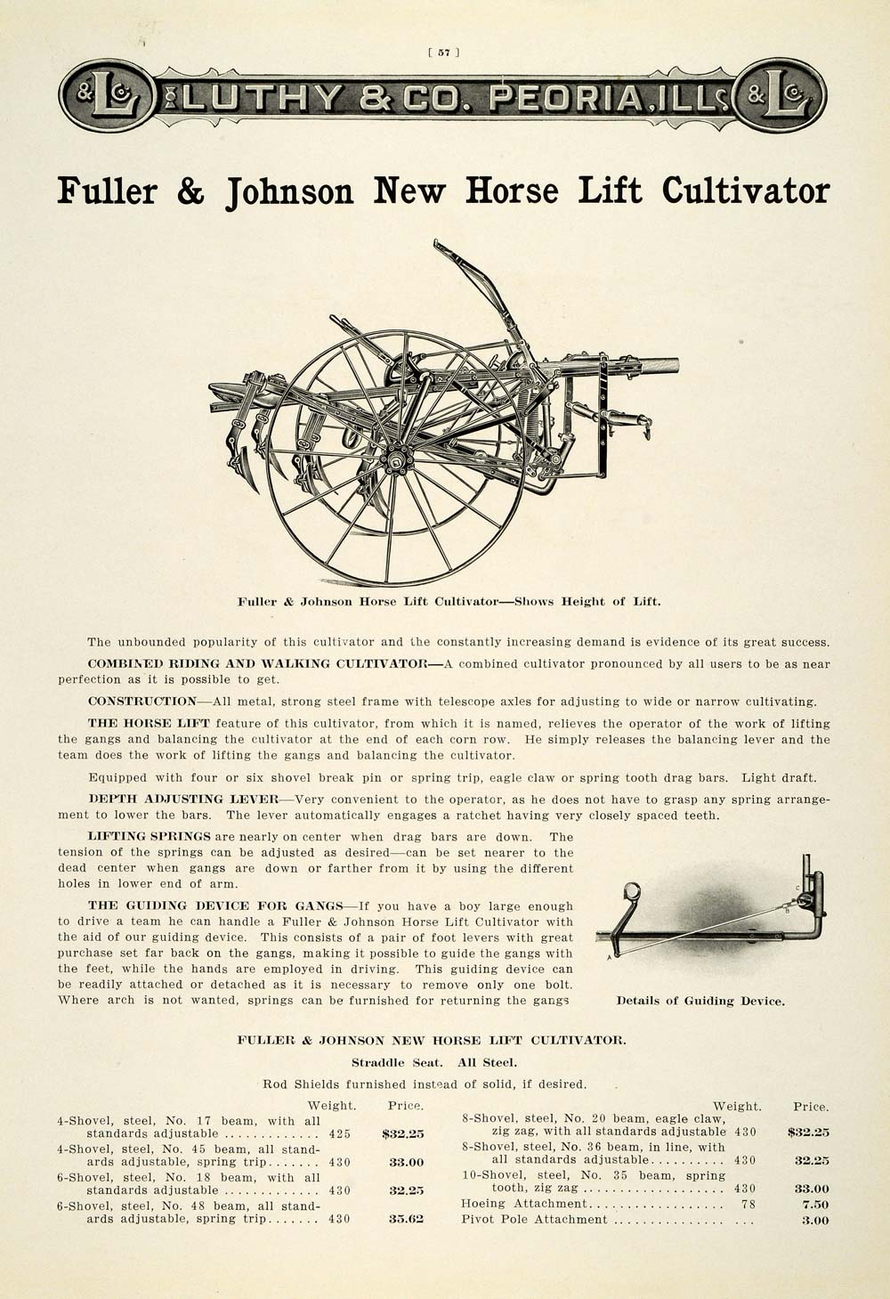 This is an original 1912 two-page (1 page, double-sided) black and white print ad for the Fuller & Johnson New Horse Lift Cultivator available from Luthy & Company, Peoria, Illinois. The ad includes illustrations showing this cultivator with the axles in and with the axles extended. Please see both images.