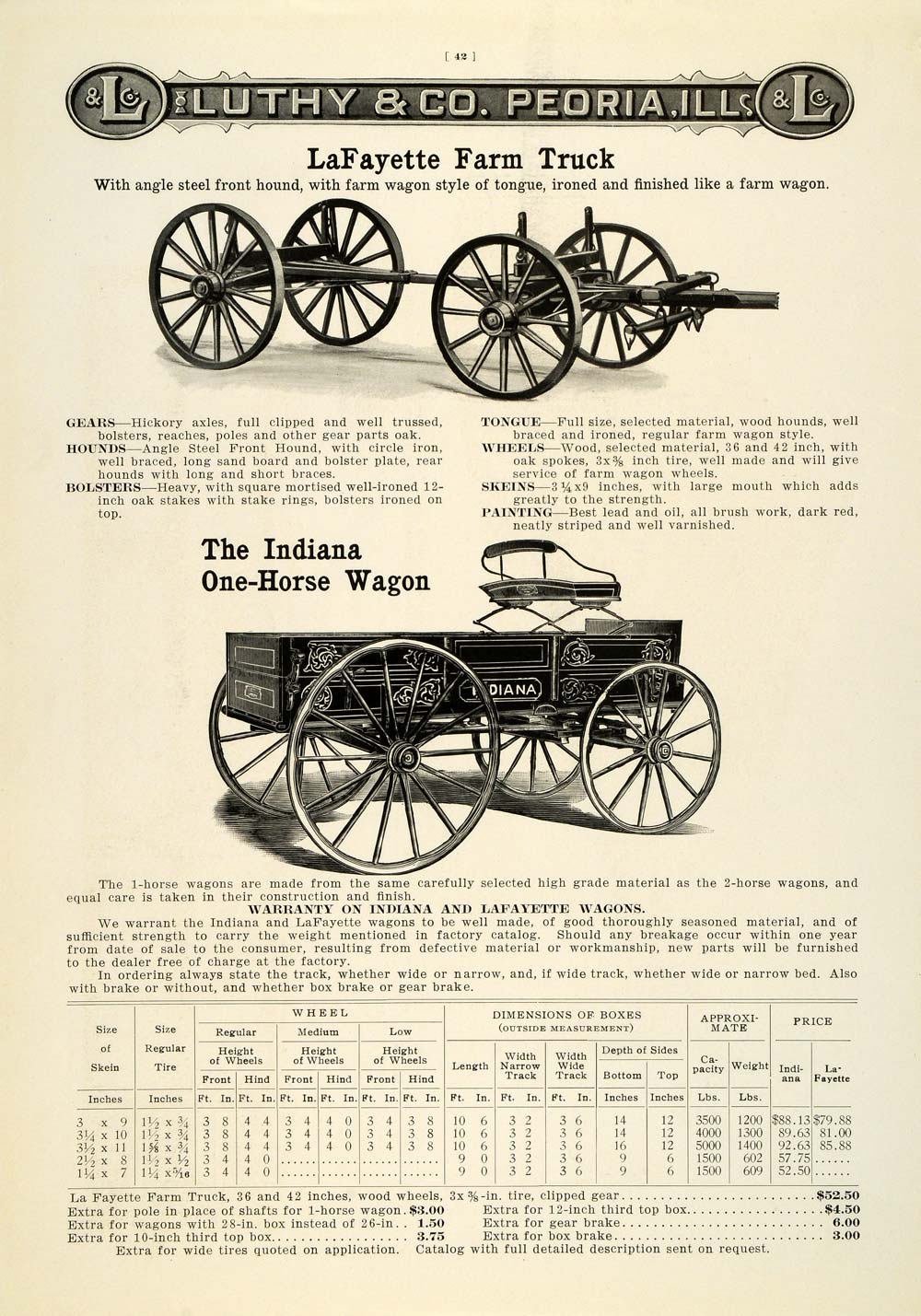 This is an original 1912 black and white print ad for the LaFayette Farm Truck and the Indiana One-Horse Wagon from Luthy & Company, Peoria, Illinois.