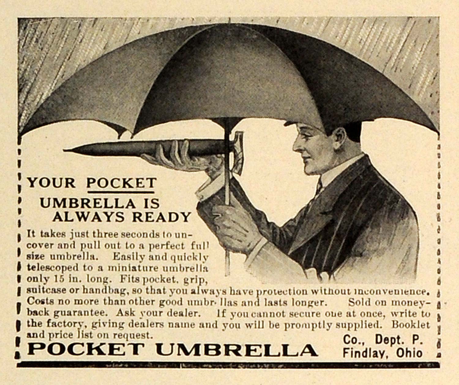 This is a small original 1912 black and white print ad for the Pocket Umbrella, made in Findlay, Ohio.