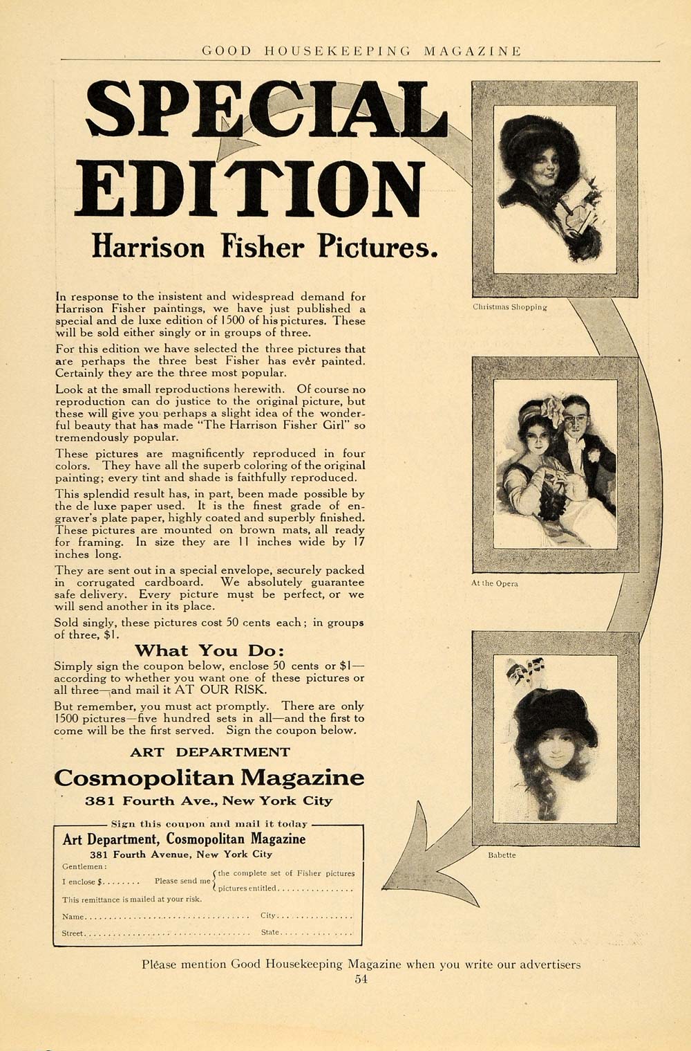 This is an original 1912 black and white print ad for Cosmopolitan Magazine, featuring the Harrison Fisher Pictures Special Edition issue. Three images title "Christmas", "At the Opera", and "Babette" featured.