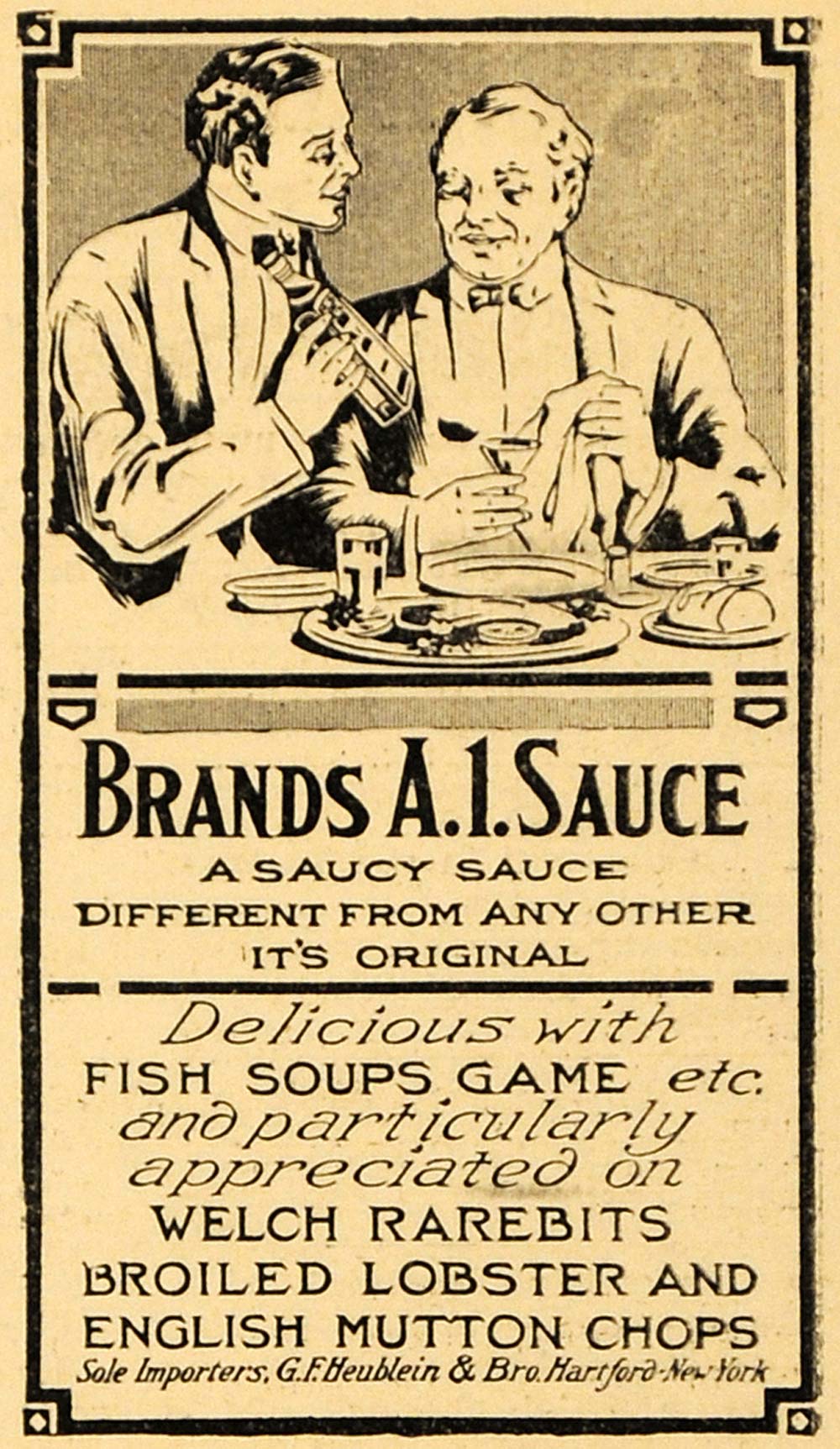 This is a small original 1912 black and white print ad for Brand's A.1. Sauce, whose sole importers are G. F. Heublein & Bro. of Hartford, New York.
