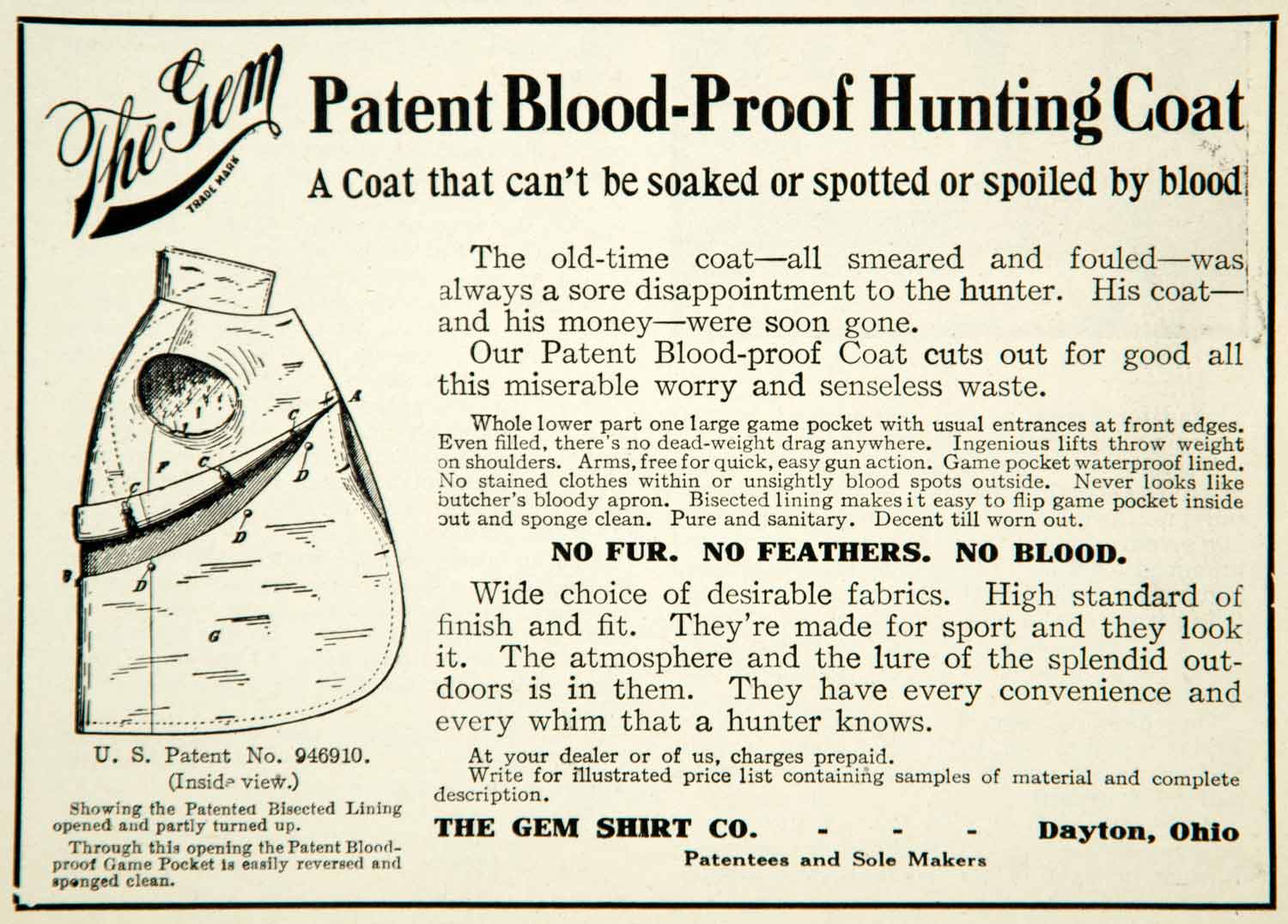 Keywords specific to this image: Vintage Advertising, Outfitter, Hunter, Hunt, Gear, Game Pocket, Ohio, Pattern, Lining, Shirt, Company