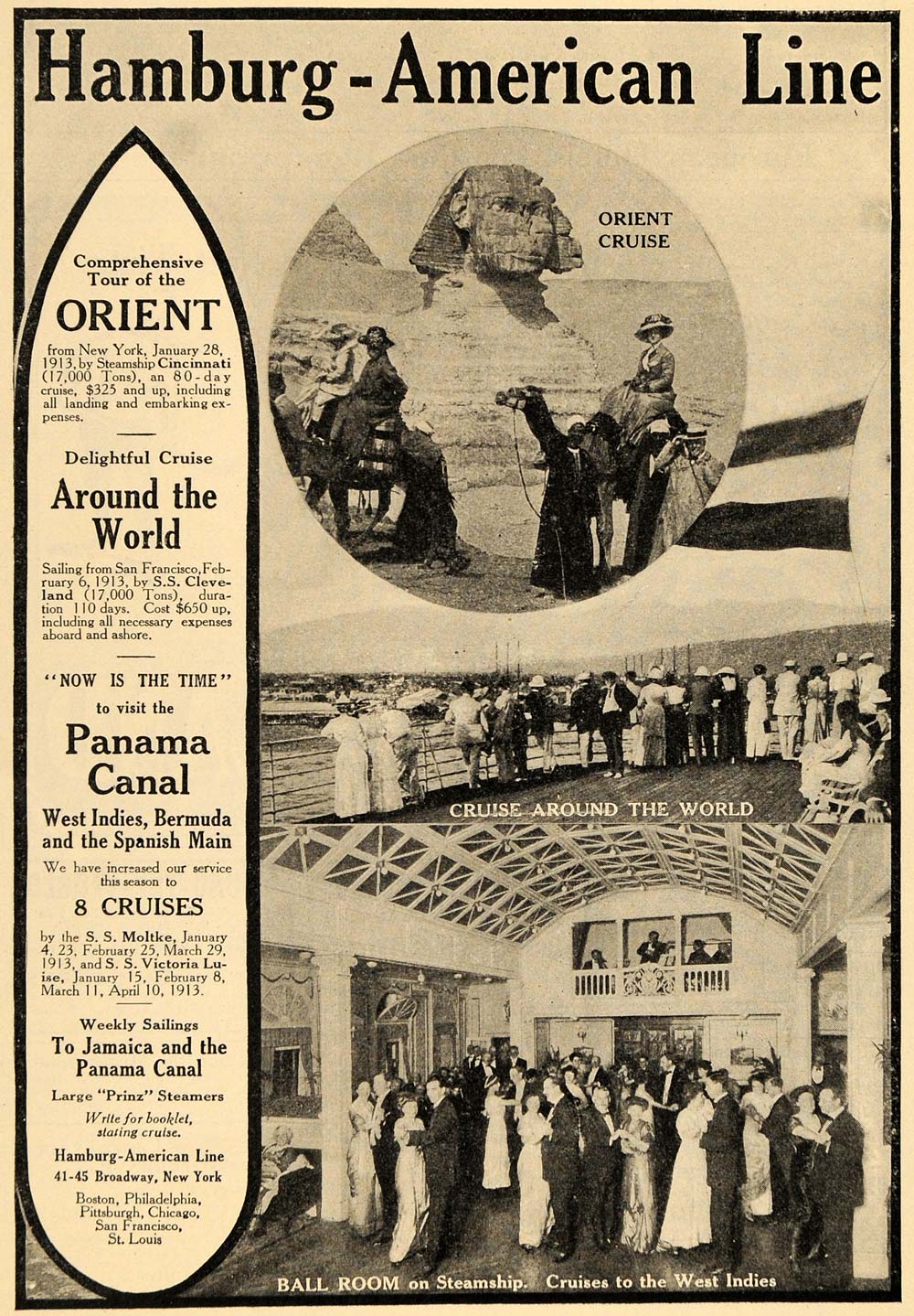 This is an original 1912 black and white print ad for the Hamburg-American Line. The ad features an image of the Egyptian Sphinx and the ballroom of the steamship.