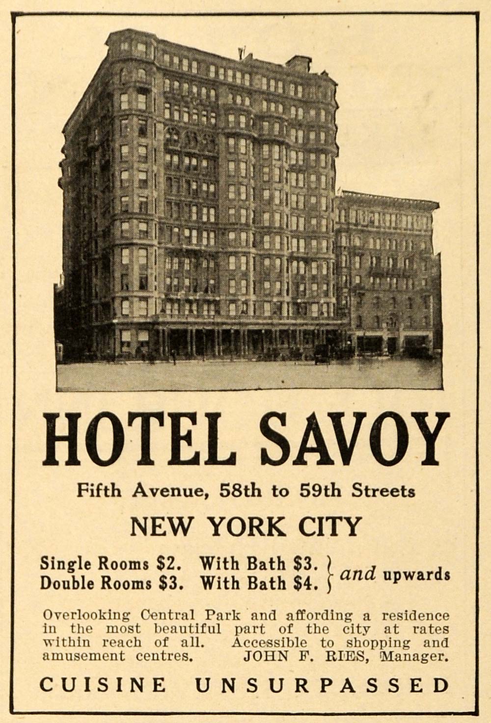 This is a small original 1912 black and white print ad for the Hotel Savoy, located at Fifth Avenue in New York City.