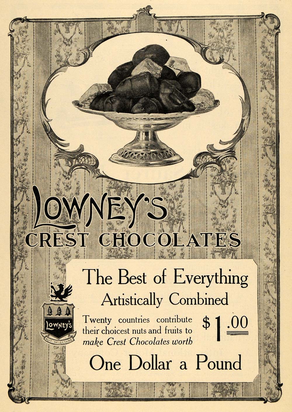 This is an original 1912 black and white print ad promoting the Lowney's Crest Chocolates.