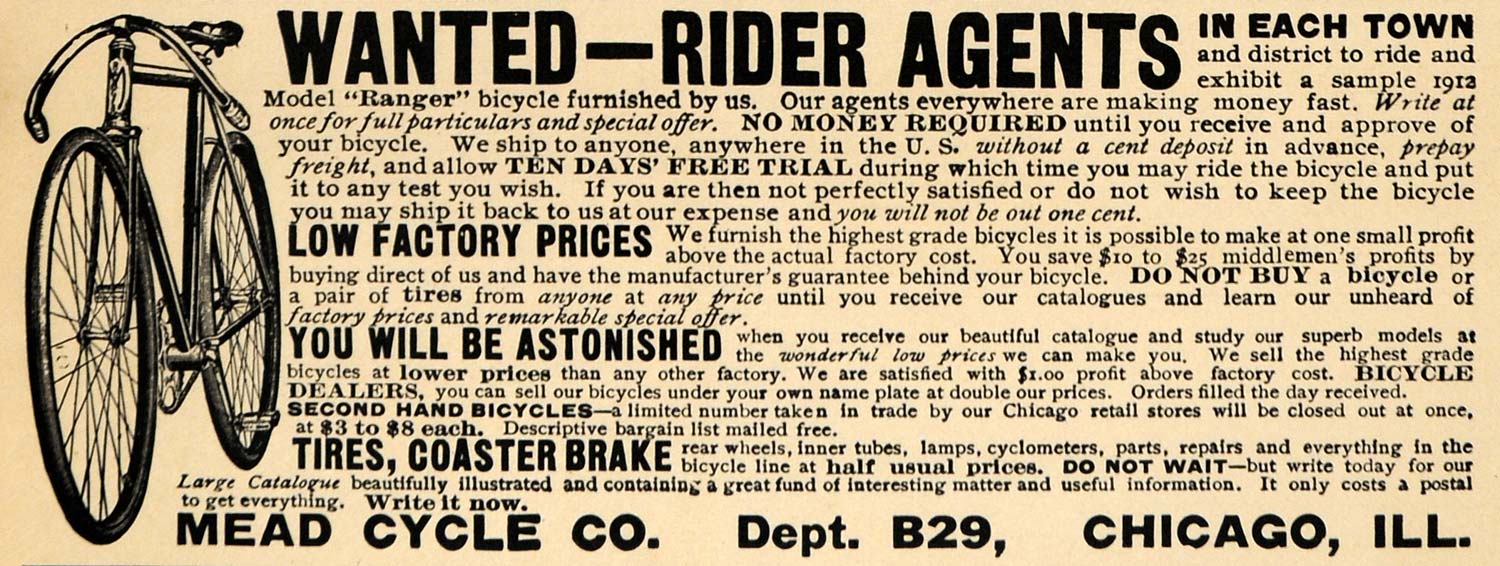 This is an original 1912 black and white print ad for the Mead Cycle Company, located at Dept. B29 in Chicago, Illinois. This ad calls out to Rider Agents.
