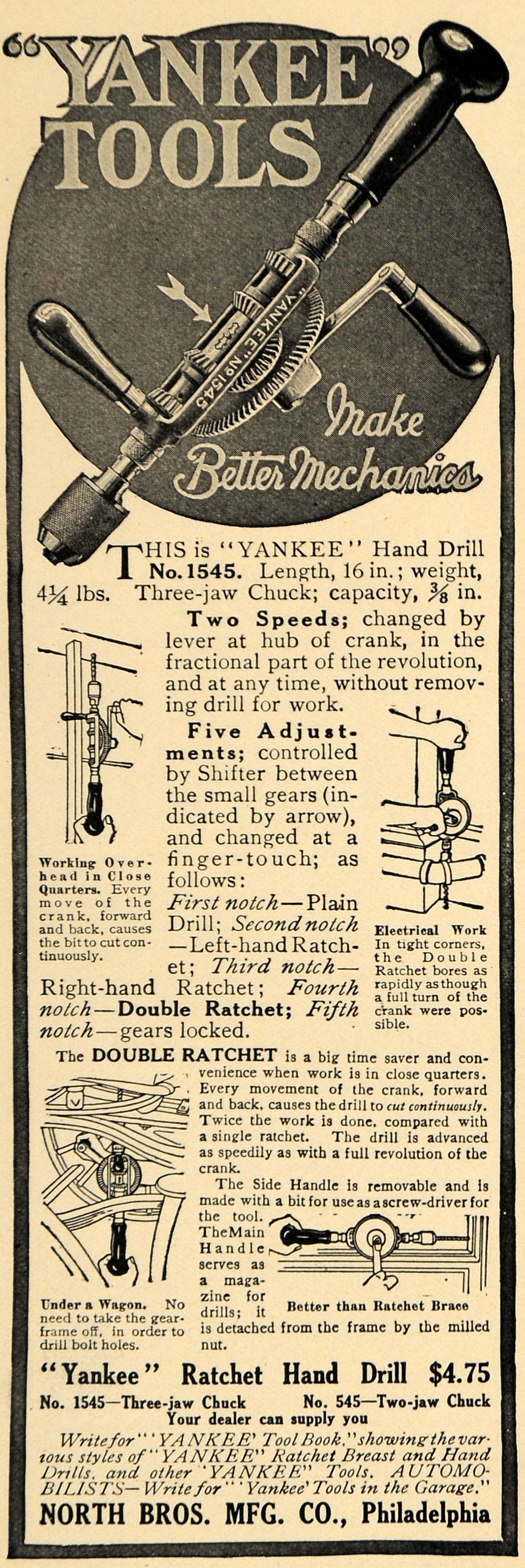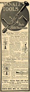 This is an original 1912 black and white print ad for the North Bros. Manufacturing Company of Philadelphia. This ad features their Yankee Tools, including the Yankee Ratchet Hand Drill with two speeds and five adjustments.