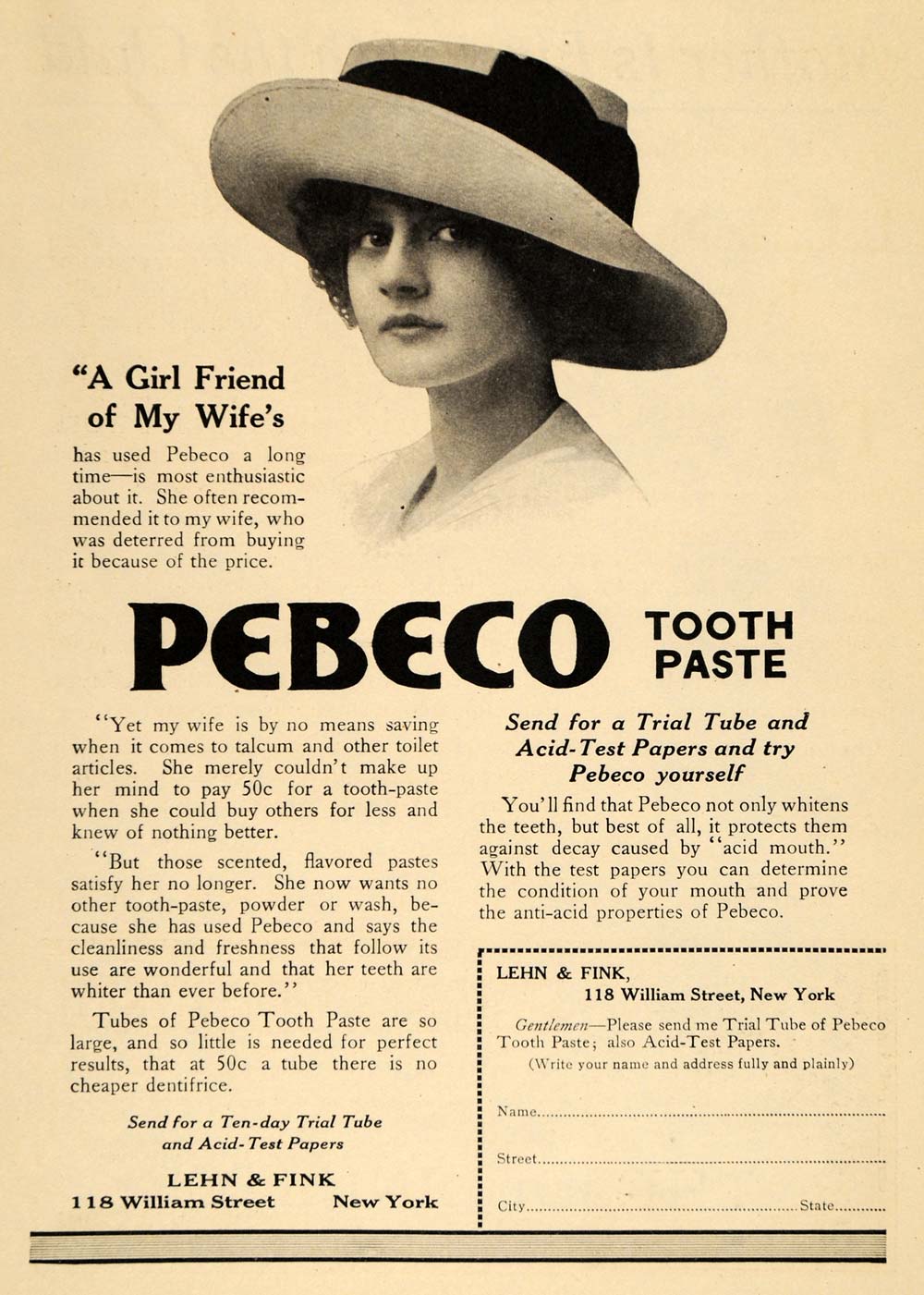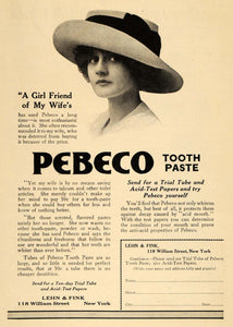 This is an original 1912 black and white print ad for Pebeco Toothpaste. The ad states, "You'll find that Pebeco not only whitens the teeth, but best of all, it protects them against decay caused by acid mouth".