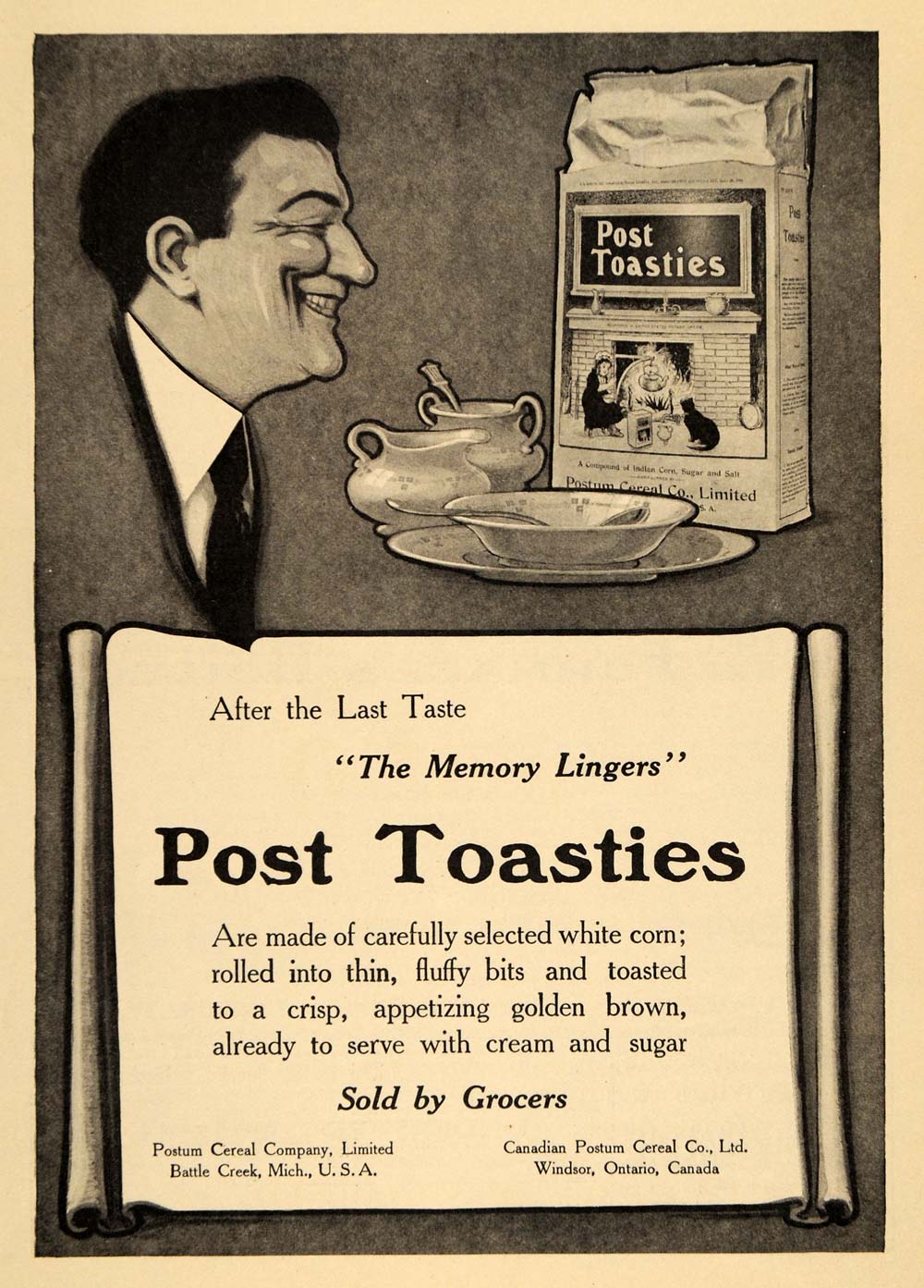 This is an original 1912 black and white print ad for the Postum Cereal Company, Limited, located in Battle Creek, Michigan, and Windsor, Ontario, Canada. This ad is for their delicious Post Toasties.