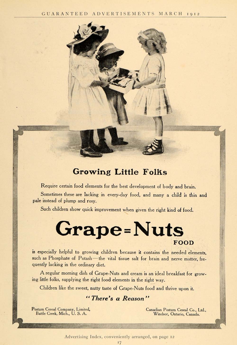 This is an original 1912 black and white print ad promoting the Grape-Nuts cereal from Postum Cereal Company, Limited located in Battle Creek, Michigan.