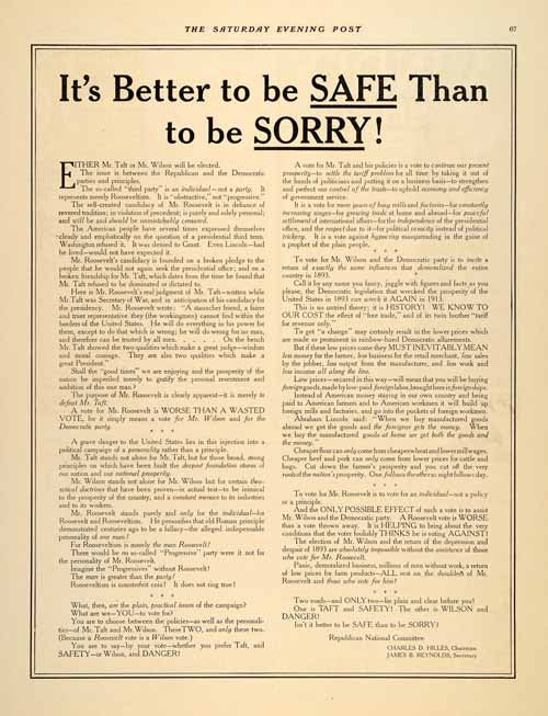 This is an original 1912 black and white print ad from the Republican National Committee. This ad was released before the 1912 presidential election between Taft, Wilson, Roosevelt, and Debs.
