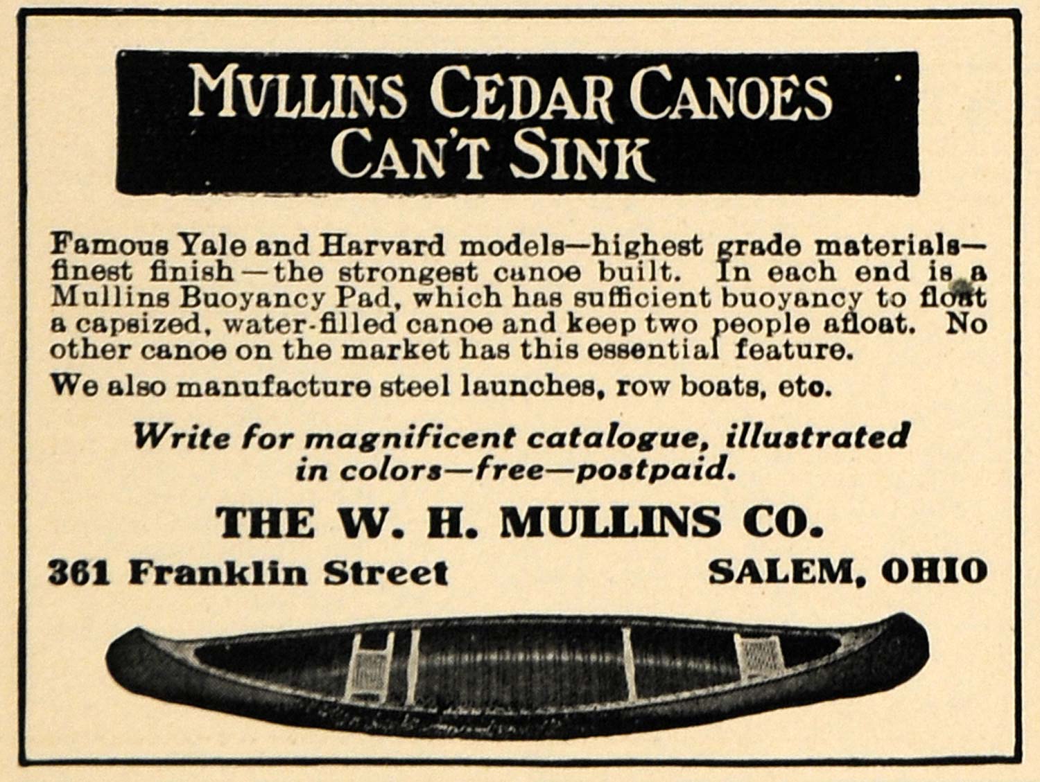 This is an original 1912 black and white print ad for the W. H. Mullins Company of 361 Franklin Street, Salem, Ohio. This ad features their Yale and Harvard cedar canoe models.