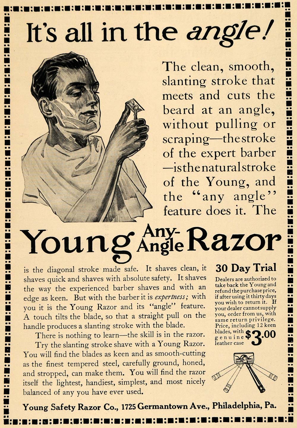 This is an original 1912 black and white print ad for the Young Safety Razor Company located at 1725 Germantown Avenue, Philadelphia, Pennsylvania.