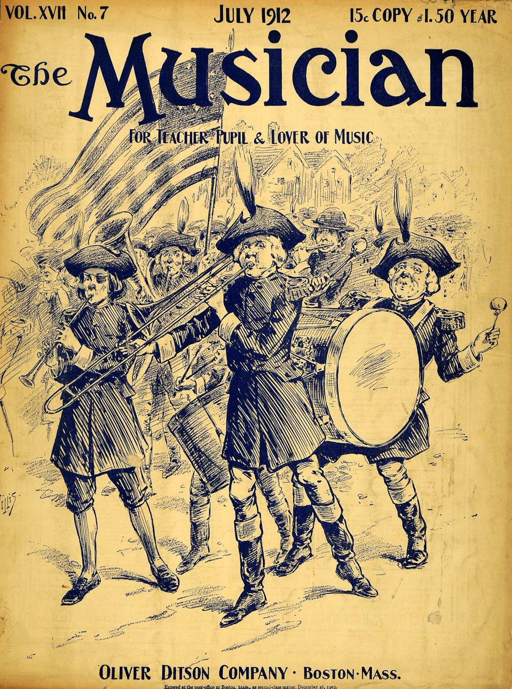 This is an original 1912 color cover for The Musician Magazine for July (Volume XVII, No. 7) from the Oliver Ditson Company of 150 Tremont Street in Boston, Massachusetts. This cover features colonial patriotic artwork by the artist J. Willis.CONDITION