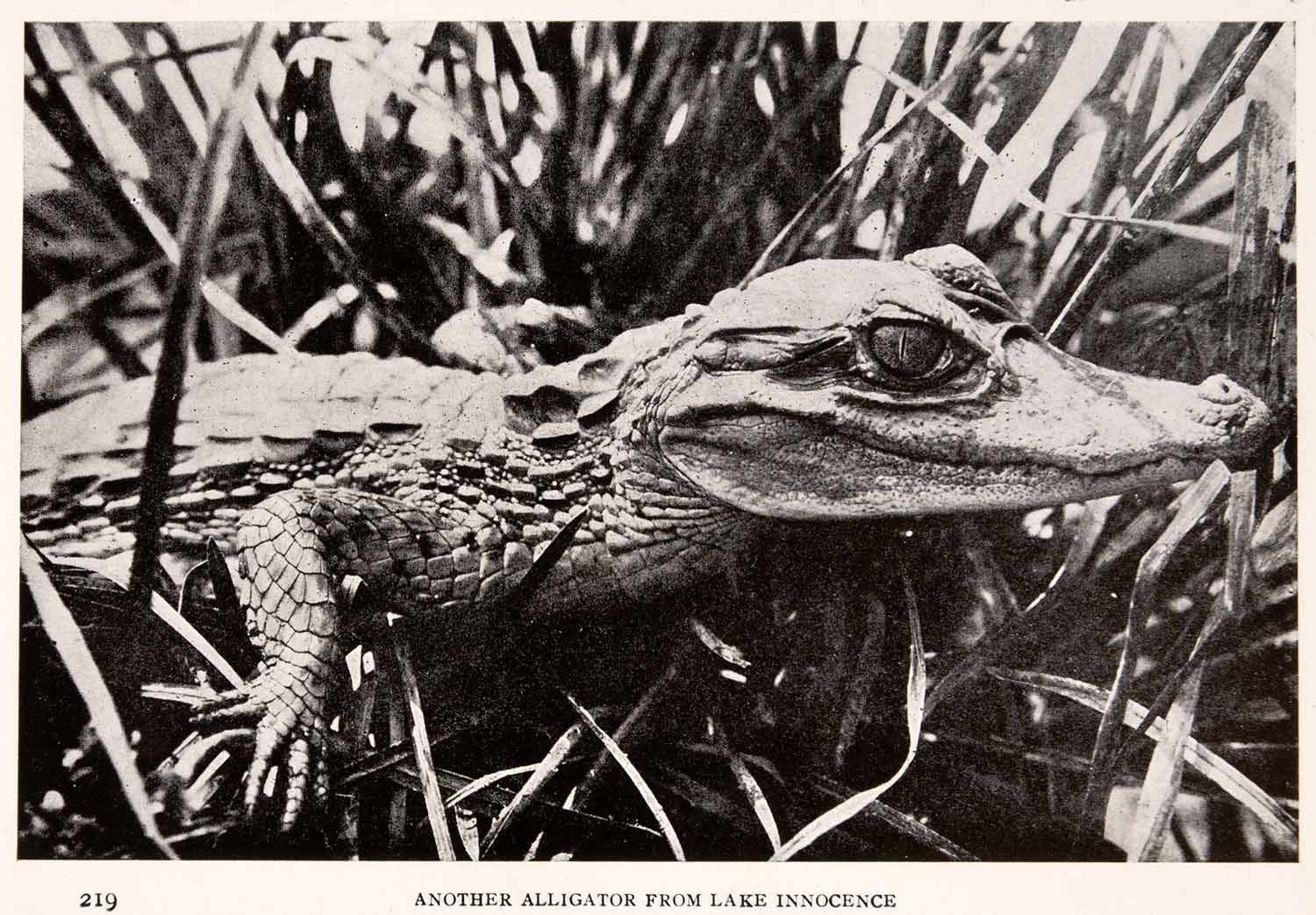 This is an original 1912 black and white halftone print of a baby alligator from lake Innocence, in Brazil.