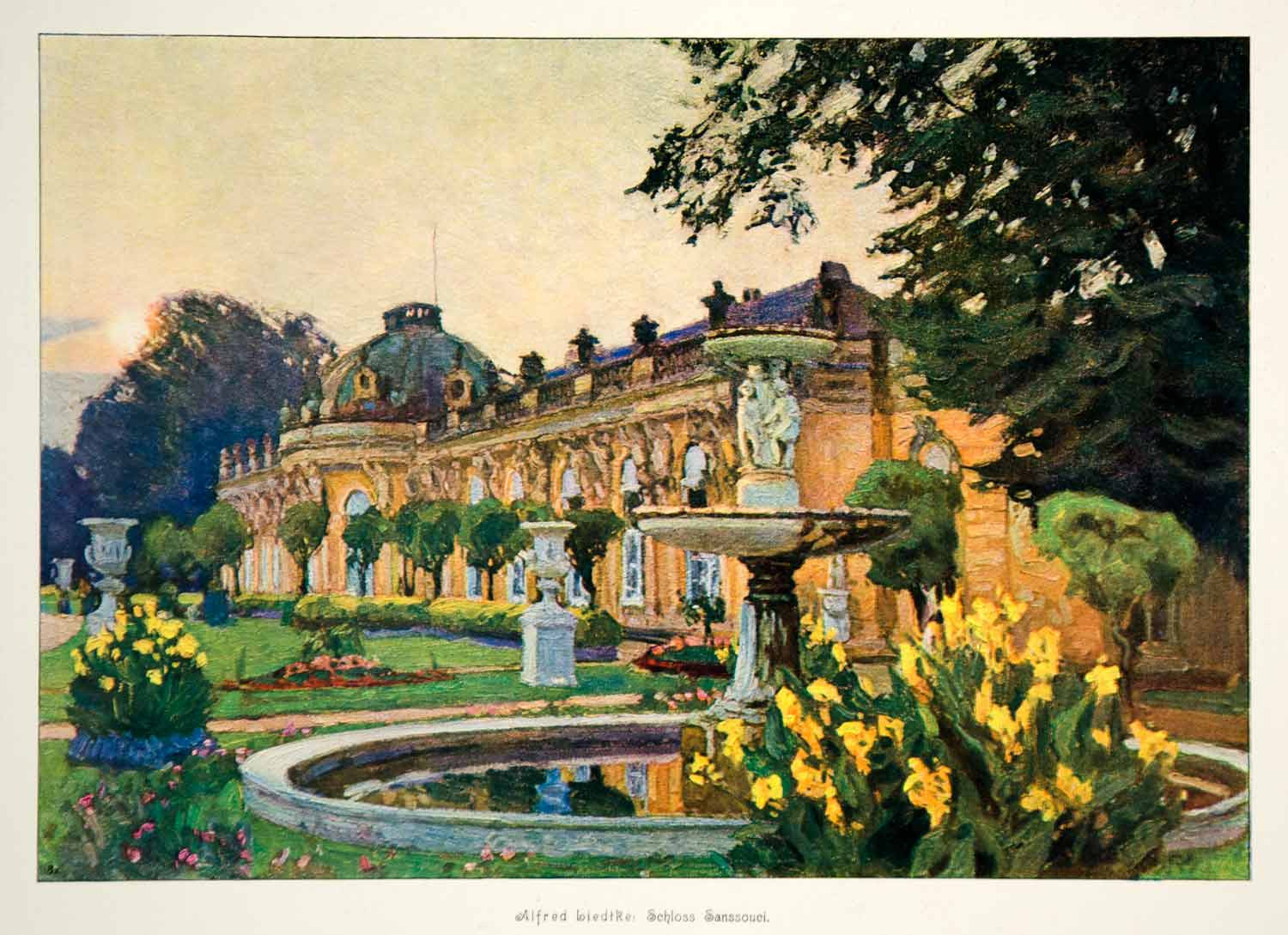 This is an original 1912 color photolithograph of a painting by the German artist, Alfred Liedtke. (1877-1914) of Sanssouci, the summer palace of Frederick the Great, King of Prussia, in Potsdam, Germany.
