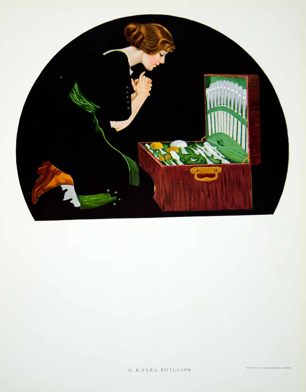Coles Phillips (1880-1927) was an illustrator known for his stylish portrayals of women. He was born in Springfield, Ohio, and attended Kenyon College. For three months, he took night classes at the Chase School of Art in Manhattan. Phillips opened up his own advertising agency thereafter, and employed several artists, including his former classmate, Edward Hopper. Phillips was hired onto the Life magazine staff at the age of twenty-six. Phillips became known for his fade-away girl; no outlines were used for the figures, but the background was cleverly tied into the foreground, and the shape of the girl could be clearly identified. He was known for his advertising illustrations for Community Plate Silverware and the Holeproof Hosiery Company.