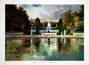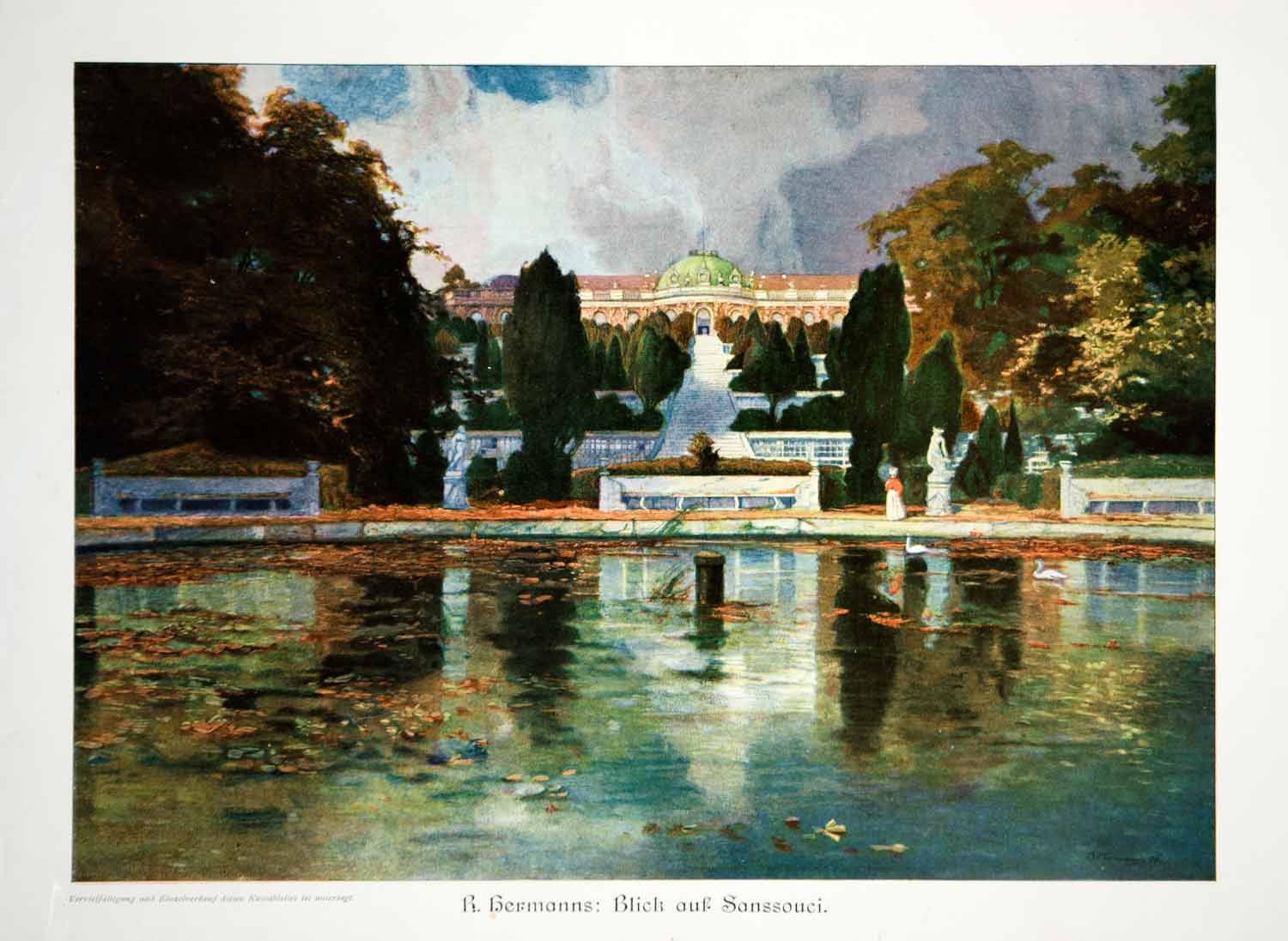 This is an original 1912 color photolithograph of a painting by R. Hermanns of a view of Sanssouci, the summer palace of Frederick the Great, King of Prussia, in Potsdam, Germany.