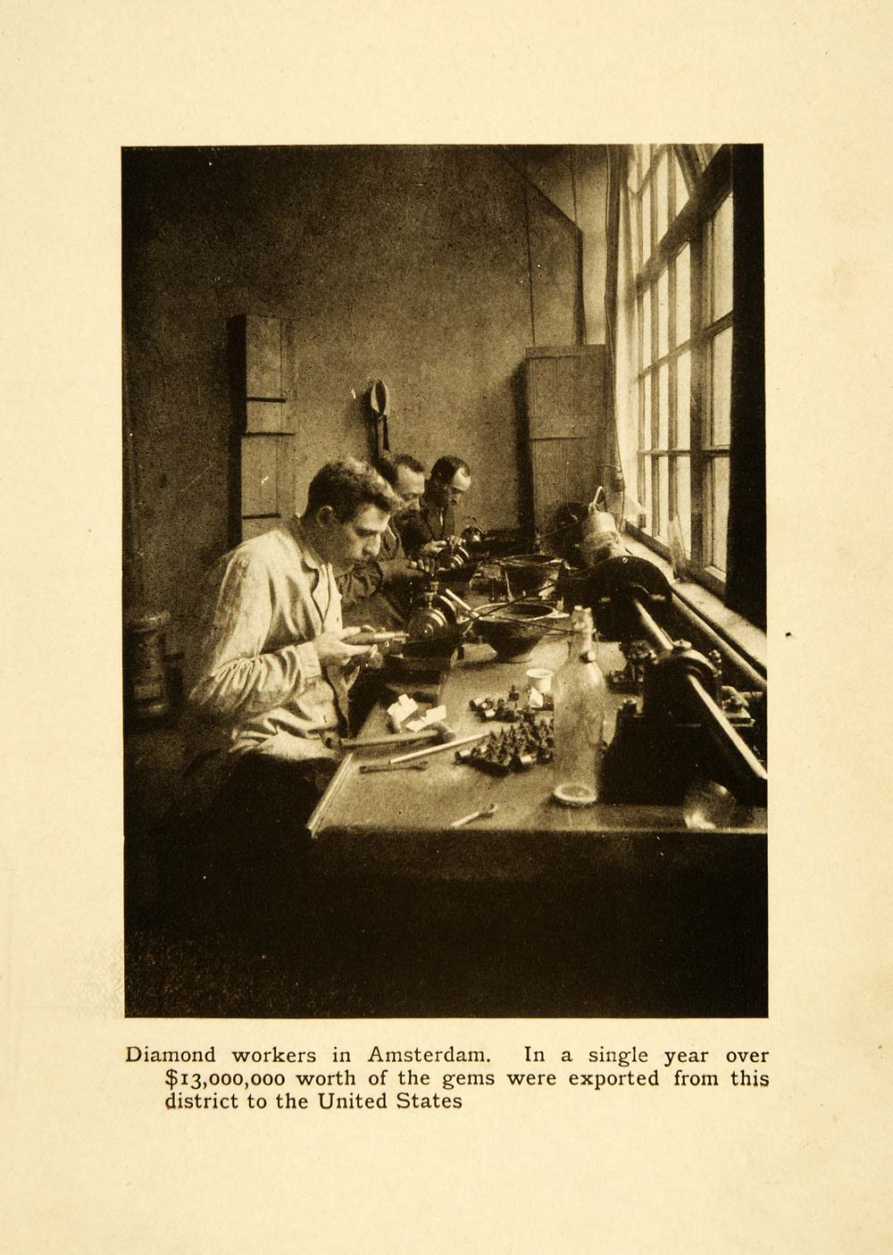 This is an original 1912 halftone print of diamond workers in Amsterdam.