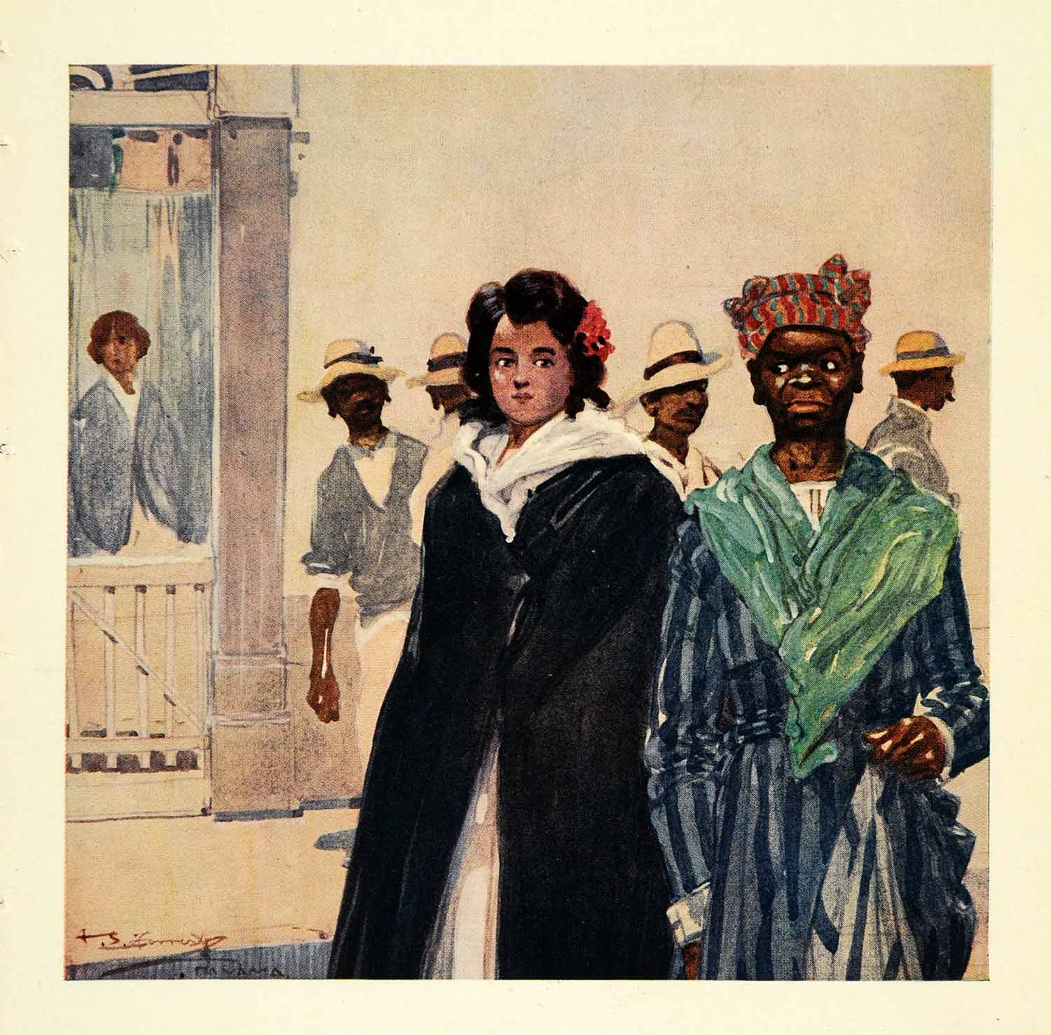 This is an original 1912 color print of "Cartagena," where all shades of colour and many strong contrasts are seen in the streets.