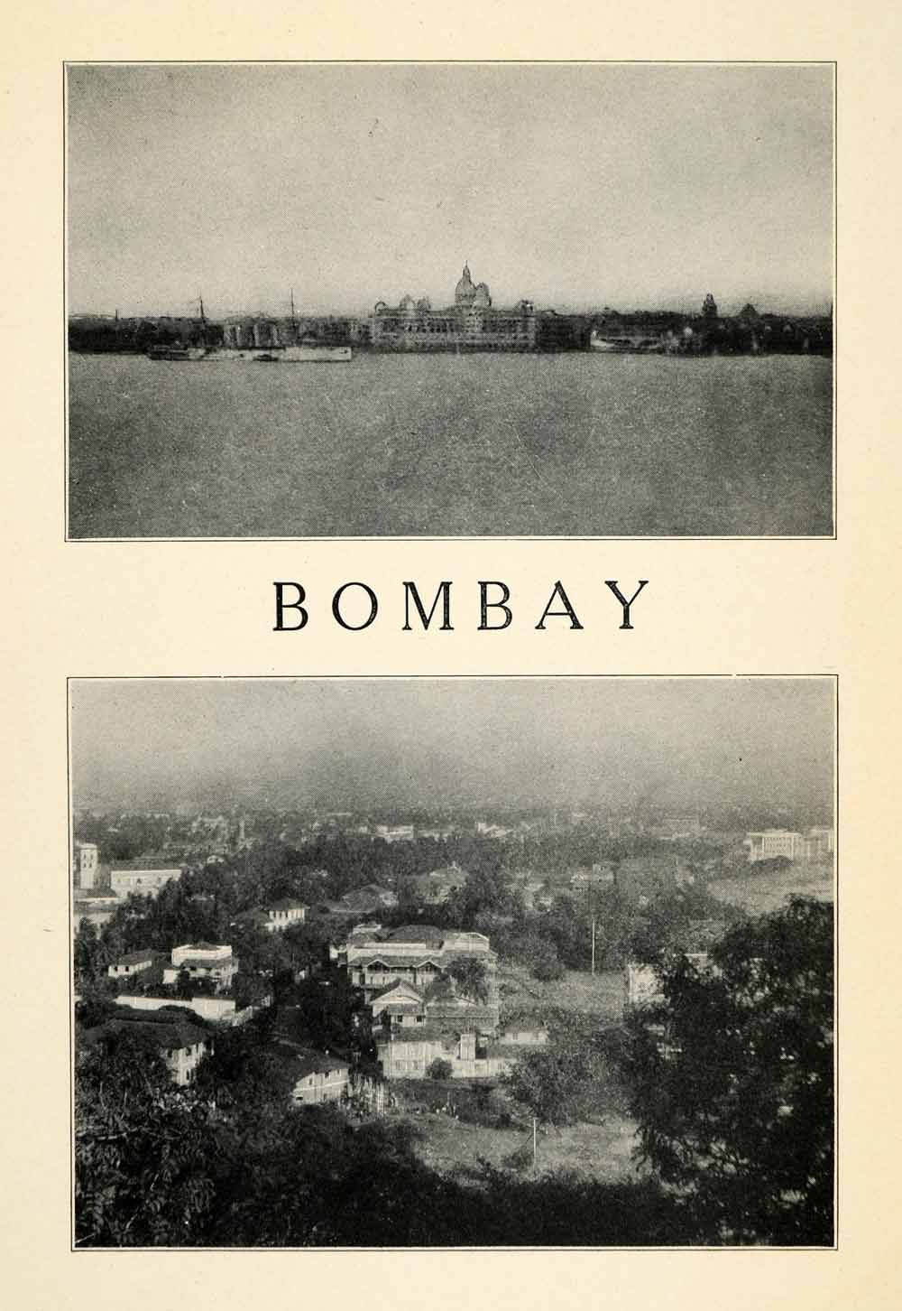 This is an original 1912 halftone print of two scenes from Bombay, India. The first depicts Wellington Pier (Apollo Bunder) in the Bombay Harbor, and the second is a gorgeous view of the city from Malabar Hill.