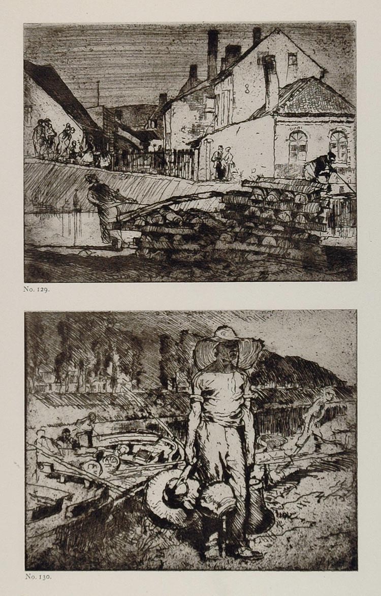 This is an original 1912 print of two etchings by Frank Brangwyn: "Canal, Dixmuden (Diksmuide)" (1908) and "The Water Carrier" (1908). Each image measures 4 x 5 inches.