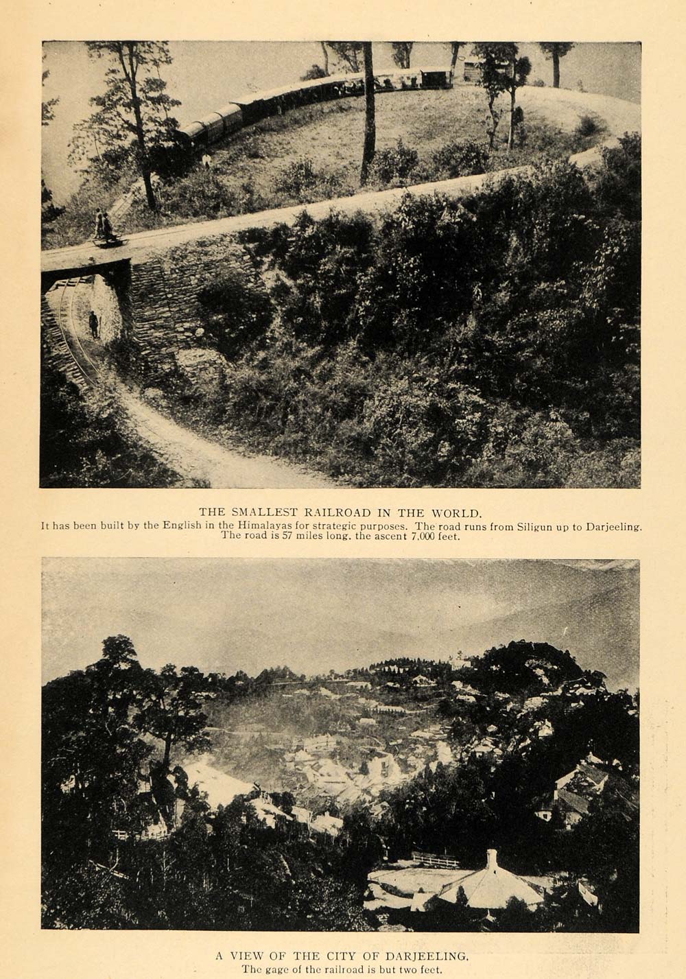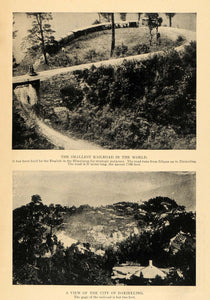 This is an original 1912 halftone print with two images of the "smallest railroad in the world." Built by the English in the Himalayas, the Darjeeling Himalayan Railway or "Toy Train" still goes from New Jalpaiguri to Darjeeling in West Bengal, India. The gauge of the railroad is two feet and it runs about 57 miles with an ascent of 7000 feet.