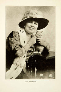 This is an original 1912 black and white halftone print of a portrait of operatic soprano and "crazy cat lady" Fely Dereyne with her pet kitten.