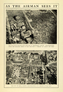 This is an original 1912 halftone print with two images featuring the gas plant and balloon grounds at Meiningen, Saxony, Germany. Photographed from the balloon when it had reached a height of about 670 feet. The second image shows the city of Jena, Saxony, Germany; photographed at a height of 984 feet.