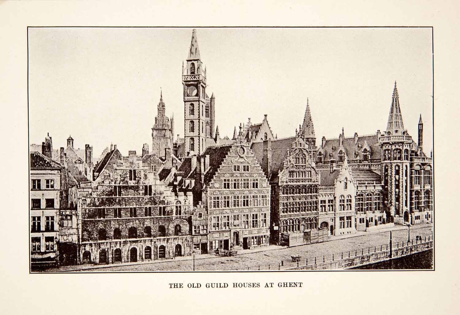 This is an original 1912 sepia halftone print of the guild houses of the city of Ghent which is located in the Flemish region of Belgium. The Flemish live in a region called Flanders and is in northern Belgium where the people often speak Dutch. Ghent is located at the confluence of the Scheldt and Lys rivers and, because of this, it became one of the richest cities in northern Europe in the Middle Ages.