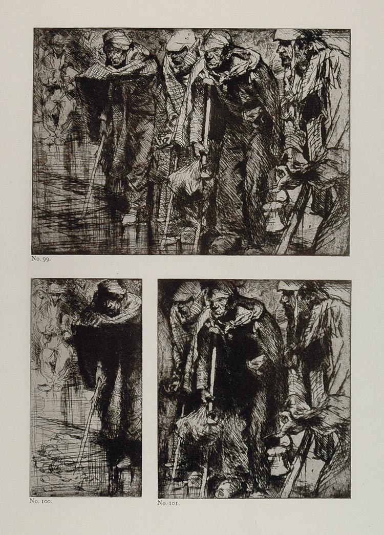 This is an original 1912 print of three etchings by Frank Brangwyn: "Beggars, No. 2" (1907), "Beggars No. 3" (1907), and "Beggars, No. 4" (1907). The images measure 4 x 5.5, 2 x 3.5, and 3.25 x 3.5 inches.