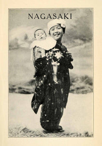 This is an original 1912 halftone print of a big sister with her new sibling, dressed in a traditional kimono and clutching flowers in Nagasaki, Japan.