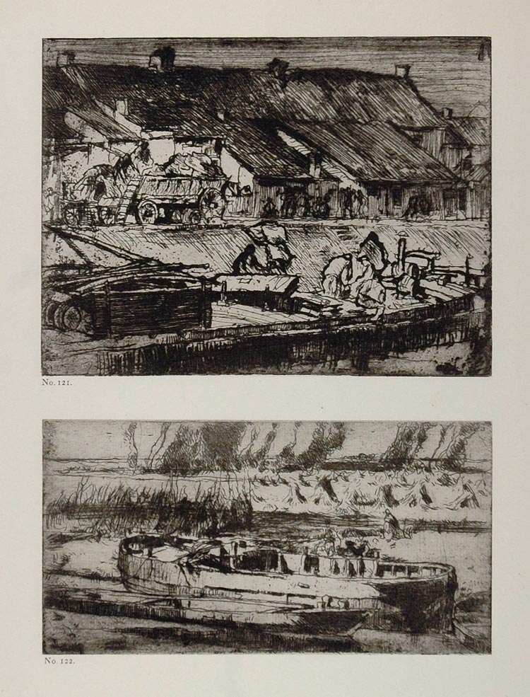 This is an original 1912 print of two etchings by Frank Brangwyn: "Old Houses, Dixmuden (Diksmuide)" (1908) and "Barges, Nieuport (Nieuwpoort)" (1908). The images measure 4.25 x 5.5, and 3 x 5.5 inches.