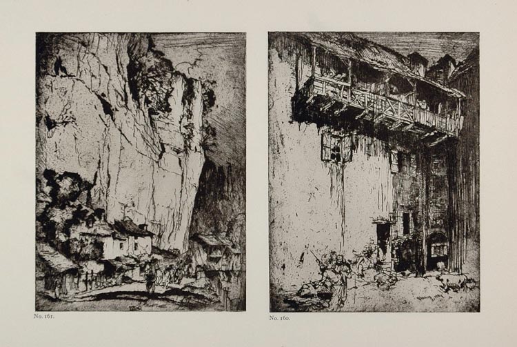 This is an original 1912 print of two etchings by Frank Brangwyn: "Old Houses, St. Cirq" (1910) and "On the Road to Figeac" (1910). Each image measures 4 x 5 inches.