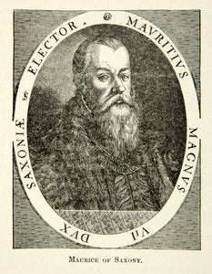 This is an original 1912 black and white relief line-block print portrait of Maurice of Saxony, who was Duke, and then Elector.