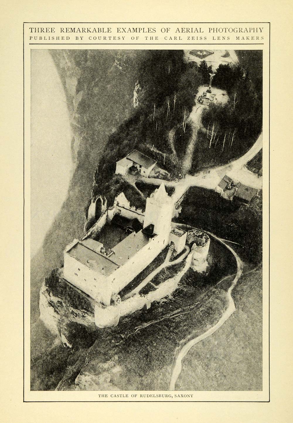 This is an original 1912 halftone print of an example of an aerial photography of the Castle of Rudelsburg, published by courtesy of the Carl Zeiss Lens makers. The Rudelsburg is located on the east bank of the river Saale, and above Saaleck, a suburb of the town of Bad Kšsen in Saxony-Anhalt, Germany. This castle was built by the Bishop of Naumburg in the Middle Ages.