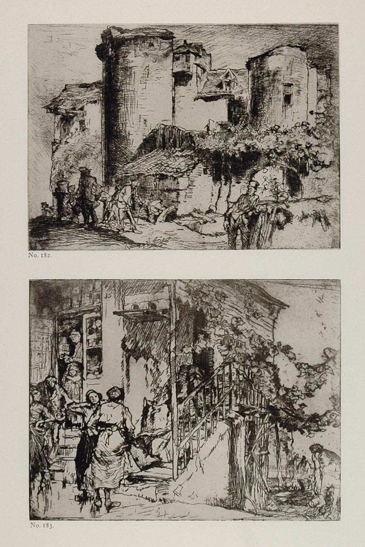 This is an original 1912 print of two etchings by Frank Brangwyn: "Tour de Faure" (1911) and "The Village Shop" (1911). Each image measures 4 x 5 inches.