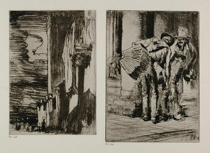 This is an original 1912 print of two etchings by Frank Brangwyn: "The Two Musicians" (1909) and "The Balcony, Messina" (1909). The images measure 4 x 5.5 and 3.5 x 5 inches.