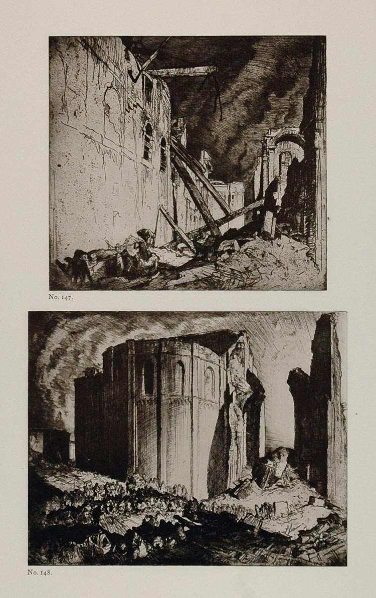 This is an original 1912 print of two etchings of Messina, Sicily showing the ruins after the earthquake of 1908, by Frank Brangwyn: "Via del Trombe, Messina" (1910) and "Apse of Duomo, Messina" (1910). The images measure 4 x 4.5 and 4 x 5 inches.