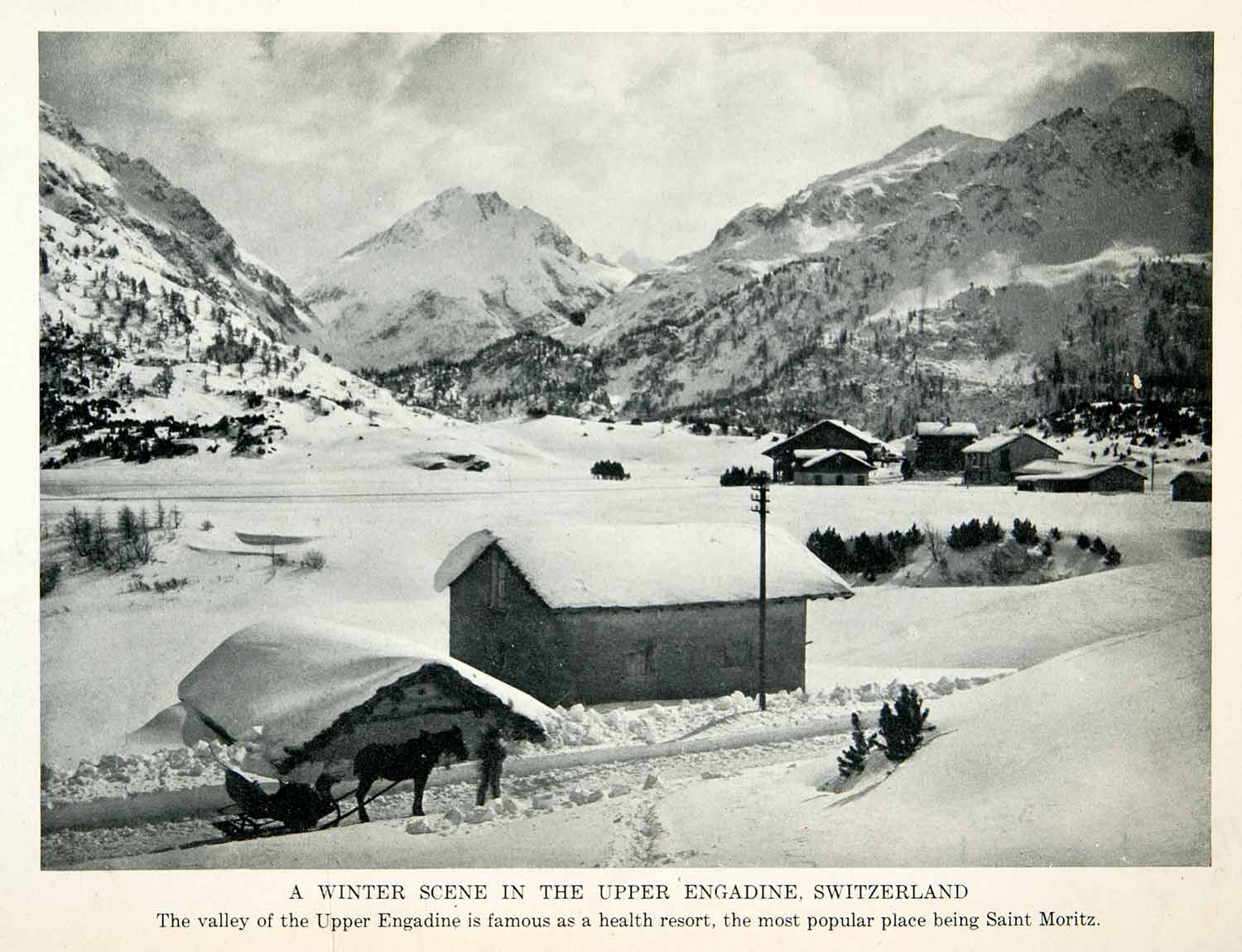 This is an original 1912 black and white halftone print of "A Winter Scene in the Upper Engadine, in Switzerland."