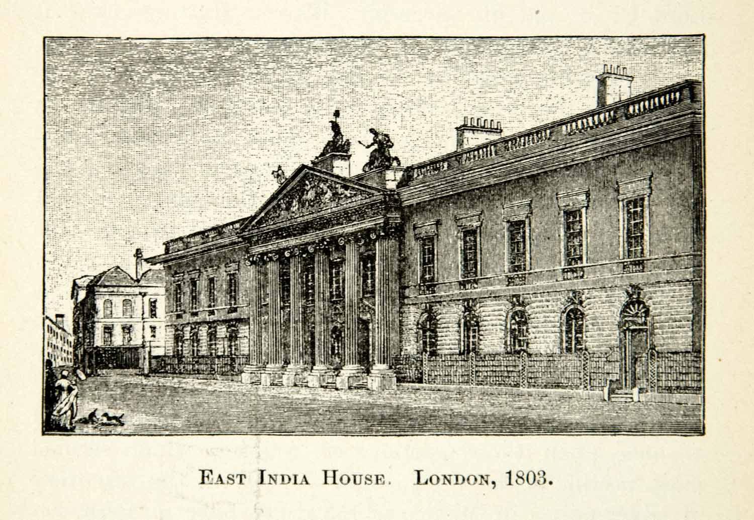 This is an original 1912 black and white in-text wood engraving of the East India House in London, England, and how it looked in 1803. The building, located on Leadenhall Street, was the offices of the British East India Company.