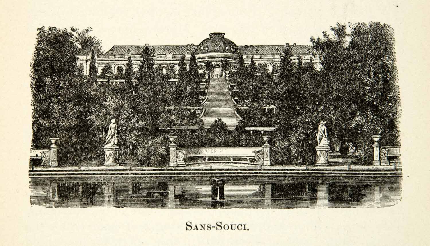 This is an original 1912 black and white in-text wood engraving ofSanssoui, which is a royal summer palace in Germany near Berlin.