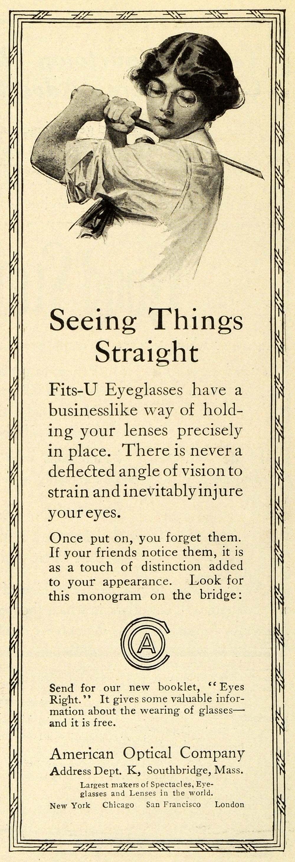 This is an original 1913 black and white print ad for the Fit-U Eyeglasses, a product line by the American Optical Company in Southbridge, Massachusetts.