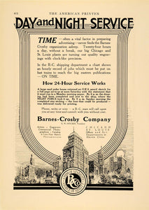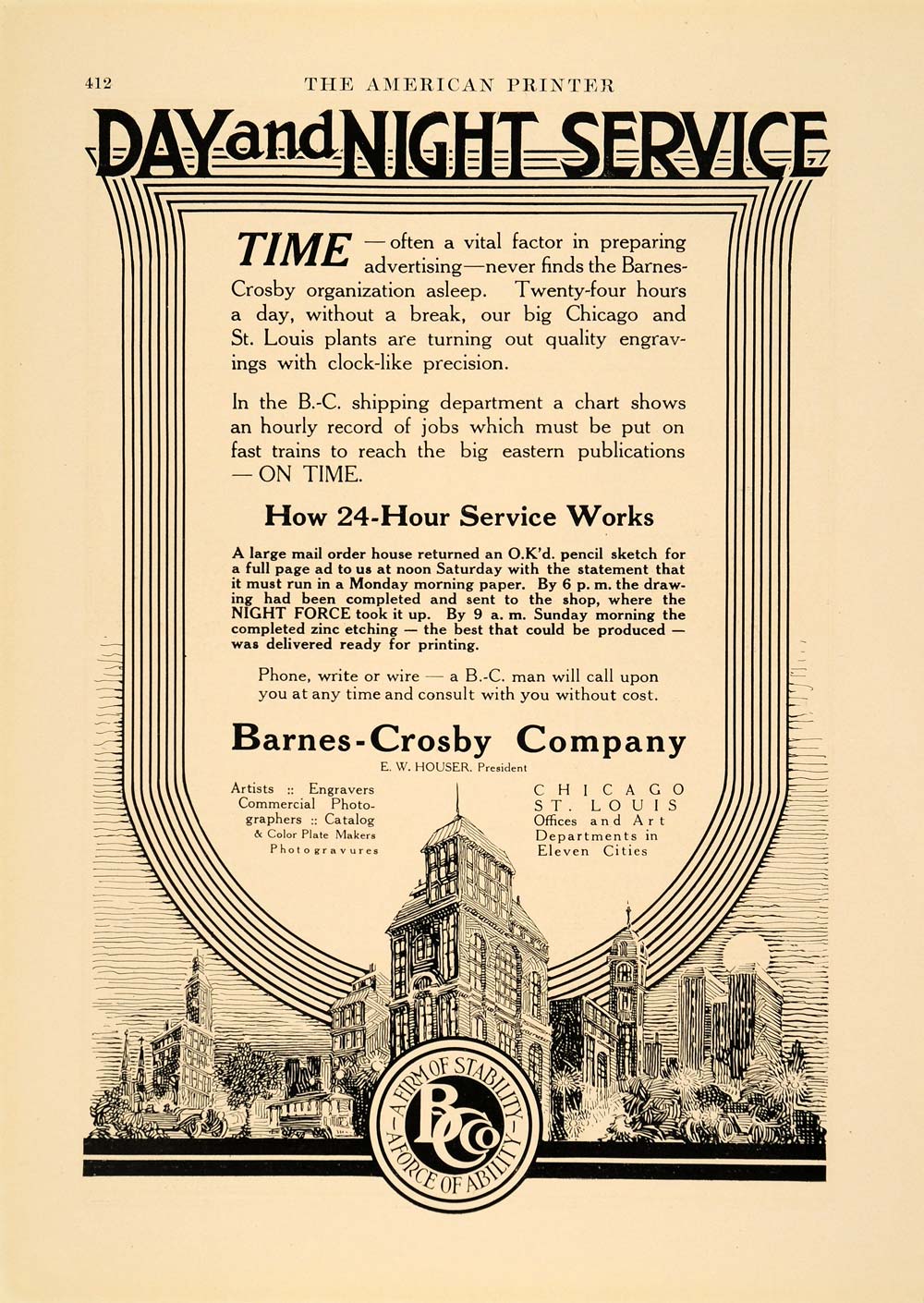 This is an original 1913 black and white print ad for the Barnes- Crosby Company of Chicago and St. Louis, --artists, engravers. commercial photographers, catalog & color plate makers, photogravures. E. W. Houser, President.