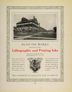This is an original 1913 color print ad for the Dunn Inks Works, Manufacturers of Fine Lithographic and Printing Inks, 1543-1551 Niagara Street, Buffalo, N. Y. The ad has a nice halftone image of the building and an illustration of their trademark.